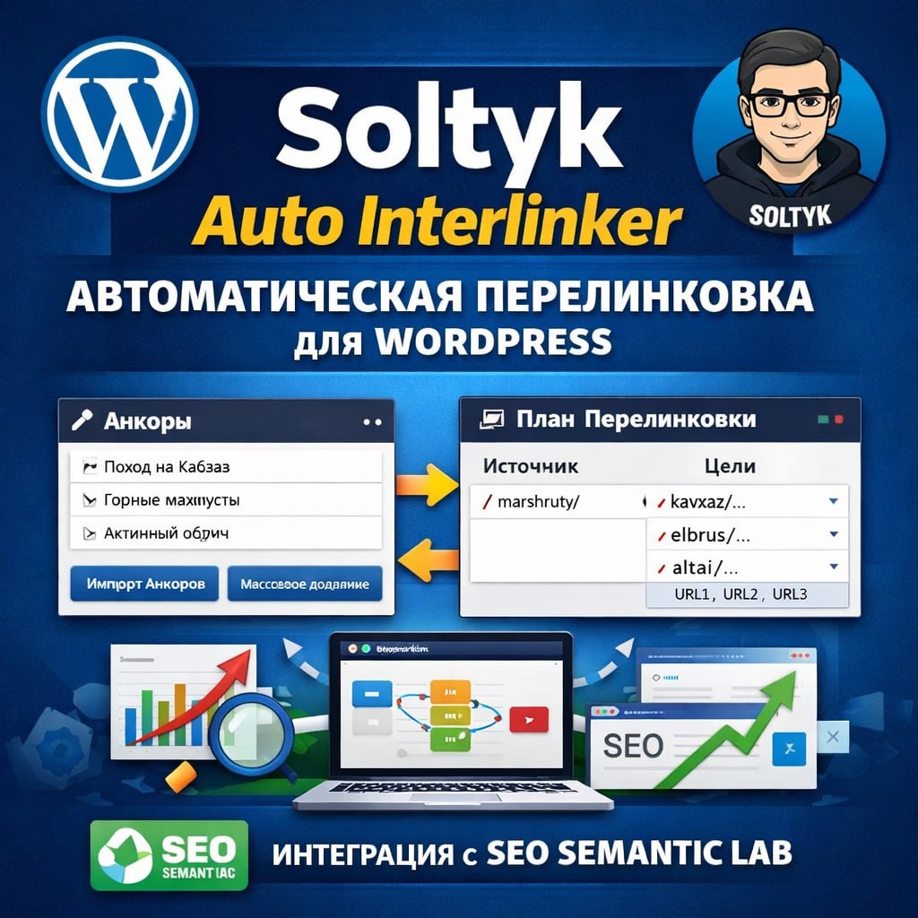 Сделал свой плагин Soltyk Auto Interlinker для WordPress. Что умеет: ✅ автоматически ставит внутренние ссылки по списку анкоров (1 раз на страницу или по лимиту) ✅ подбирает релевантные страницы по title/meta ✅ можно вручную управлять связями и задавать “план перелинковки” (страница → куда ссылаться) ✅ отчёт: где какие ссылки стоят (анкор + окружение) ✅ интеграция с SEO Semantic Lab: импорт анкоров/плана из таблиц (или массовая вставка списком) Можно использовать и без SEO Semantic Lab — просто загружаете/вставляете анкоры и управляете всё из админки WP. Стоимость: * Плагин: 2 990 ₽ (разово) * Установка/настройка/доводка под ваш сайт: — разовые задачи: 2 500 ₽/час — пакет от 10 часов: 2 000 ₽/час Кому нужно — пишите в личку, поставлю и настрою под ваш сайт.