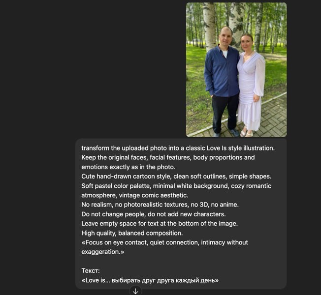 💌 Скоро 14 февраля, и если хочется сделать что-то тёплое и личное, ловите идею. Сейчас можно сделать валентинку в стиле Love Is, но со своими лицами и своей историей. Выбираете любую нейросеть, я делала в ChatGPT, добавляете фото и промпт. Вот такой промпт ⬇️ Сохраняйте, экспериментируйте и пробуйте. Текст для подписи может быть любой. Промпт: Transform the uploaded photo into a classic Love Is style illustration. Keep the original faces, facial features, body proportions and emotions exactly as in the photo. Cute hand-drawn cartoon style, clean soft outlines, simple shapes. Soft pastel color palette, minimal white background, cozy romantic atmosphere, vintage comic aesthetic. No realism, no photorealistic textures, no 3D, no anime. Do not change people, do not add new characters. Leave empty space for text at the bottom of the image. High quality, balanced composition. Текст: «Love is… выбирать друг друга каждый день» Если будете делать, покажите в комментариях или напишите, ко