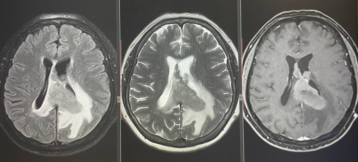 МРТ ГМ того же пациента. Исследование обладает большей информативностью: последовательности FLAIR, T2 и T1 с контрастным усилением дают более наглядную визуализацию лимфомы. #лимфомагммрт