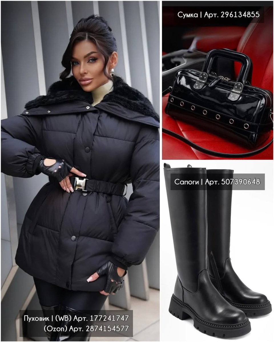 В этих шести находках уже собран идеальный рецепт: силуэт + фактура + правильная палитра. Чёрный пуховик с поясом даёт эффектную форму, шоколадная куртка добавляет мягкой роскоши, обувь закрывает все сценарии — от практичных сапог до элегантных ботильонов, а аксессуары (лаковая сумка и меховой шарф) поднимают образ на уровень выше.