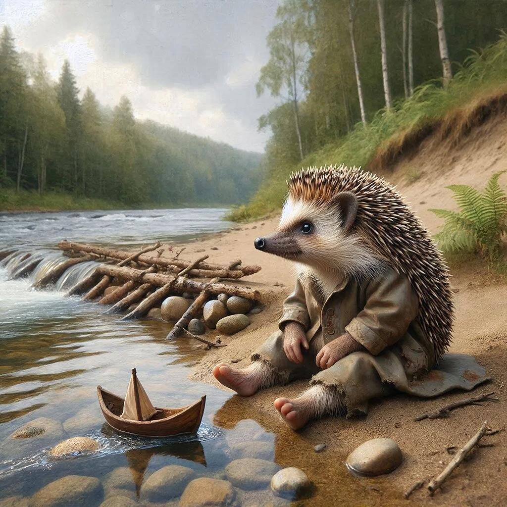 На берегу одной большой-большой Реки жил-был Ёжик. И была у него тайная работа, на которую он сам себя устроил - он управлял Миром. И началось это не просто так. Однажды, уже давным-давно, случилась в его жизни большая буря. Ветер был такой силы, что вырывал корни, вода смывала всё знакомое, а мир перевернулся с ног на голову. Маленький Ёжик в той буре едва уцелел, вцепившись в один-единственный торчавший из земли корешок. И тогда он сделал вывод, что все это из-за него, что он просто невнимательный, он плохо старался и что-то упустил. И поэтому, чтобы больше никогда не повторился весь этот беспорядок, нужно взять ответственность на себя и контролировать. Всё. Абсолютно всё. И начал Ёжик с малого: раскладывал хвоинки по цветам и размерам, вел журнал времени восходов и закатов, составлял расписание движения по дорожкам для муравьёв. Потом взялся за Реку. Ёжик строил сложные плотины из палок и камней, направлял ручейки в, как ему казалось, более правильное русло, яростно боролся с любым