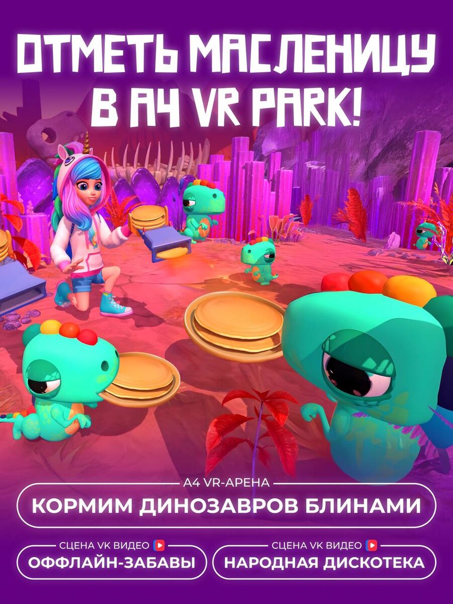 🥞🔤🔤🔤🔤🔤🔤🔤🔤🔠🥞 Готовы отметить праздник так, как вы ещё никогда не делали? ➖Вместо сковородок — блины ➖Вместо чучела — динозавры ➖Вместо обычных игр — огромная VR-арена 250 м², где нужно кормить цифровых гигантов виртуальными блинами А после VR — продолжаем праздник: ➖офлайн-игры и конкурсы ➖танцы и драйв ➖живая атмосфера на сцене VK Видео 🥞 А 21 и 22 февраля — угощаем настоящими блинами! Приходите с друзьями, семьёй или коллегами — будет шумно, технологично и по-настоящему весело☀️ 16–22 февраля, А4 VR PARK