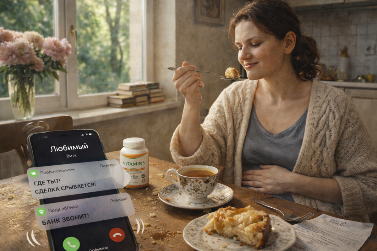 Катя сидела на своей кухне, солнце заливало паркет тёплым янтарным светом. На столе стояла ваза со свежими пионами, купила их себе сама, впервые за полгода не экономя. В духовке пёкся пирог с яблоками. Запах корицы и теста вытеснил все страхи.