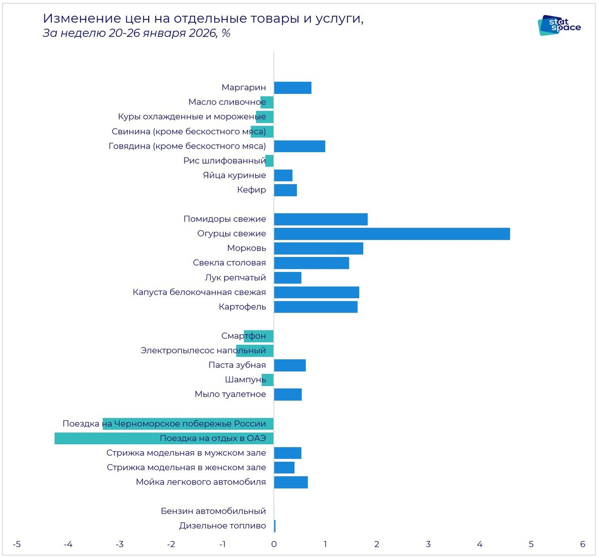 ? За неделю с 20 по 26 января цены в России в среднем выросли на 0.19% - даже чуть меньше, чем за аналогичную (21-27 января) неделю прошлого года, тогда было 0.22%. Хотя накопленные 1.91% с начала года - это всё равно заметно больше, чем прошлогодние 1.14% (и там они были за 27 дней, а не 26!). Тем не менее, картина сейчас вполне себе умеренная: продовольствие (кроме овощей-фруктов, конечно же, но и в них рост затихает) ведёт себя разнонаправленно, но без больших скачков (кроме, разве что, +1% к ценам на говядину за неделю - но свинина и курица подешевели!); непродовольственные товары в целом тоже, техника скорее даже дешевеет. Заметно дорожают услуги: порядка +0.5% к средним ценам на стрижку и +0.66% - на автомойки (и это, возможно, в том числе и эффект НДС на прежде малый и без-НДСный бизнес). Топливо зато радует: символические +0.01% на бензин и +0.03% на дизель!