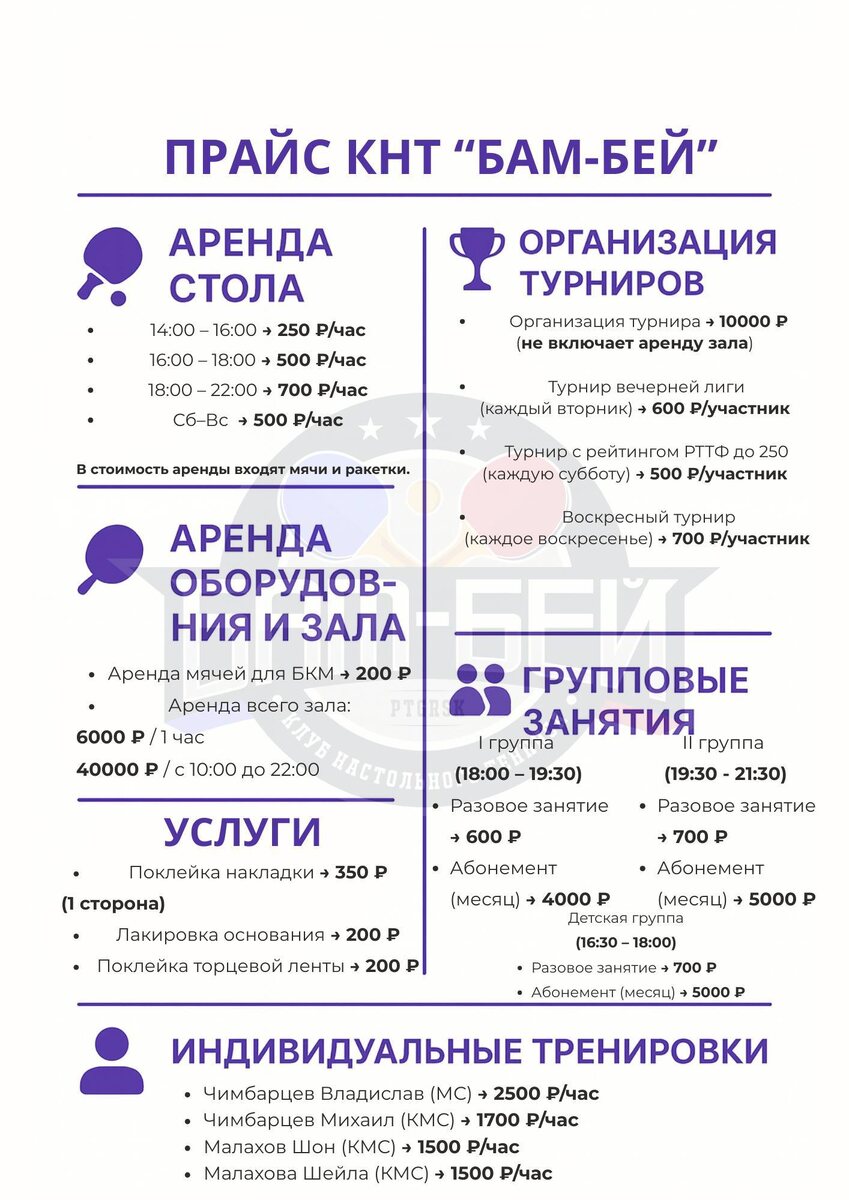 Обновленный прайс по услугам клуба, который будет действовать с 01.02.2026 года🏓🏆