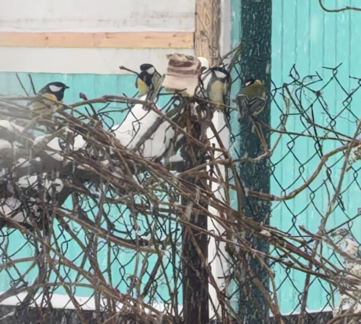 На улице снегопад не унимается, а у синичек праздник. Повесила на забор кусочек сала и любуюсь! Они стайкой, щебеча, подлетают и клюют его. И так радостно на душе!