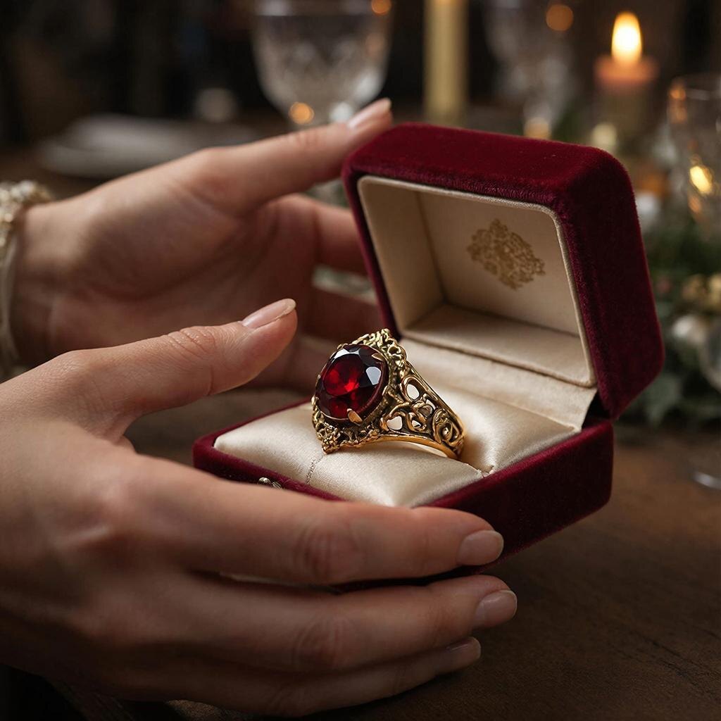 Гости зааплодировали. Я открыла коробочку и ахнула. На белом атласе лежало массивное золотое кольцо с крупным тёмно-красным камнем. Гранат? Рубин? Камень переливался в свете люстры, будто внутри него тлели угли. Работа была старинной, явно дореволюционной — витиеватые узоры оплетали оправу, создавая замысловатое кружево металла.