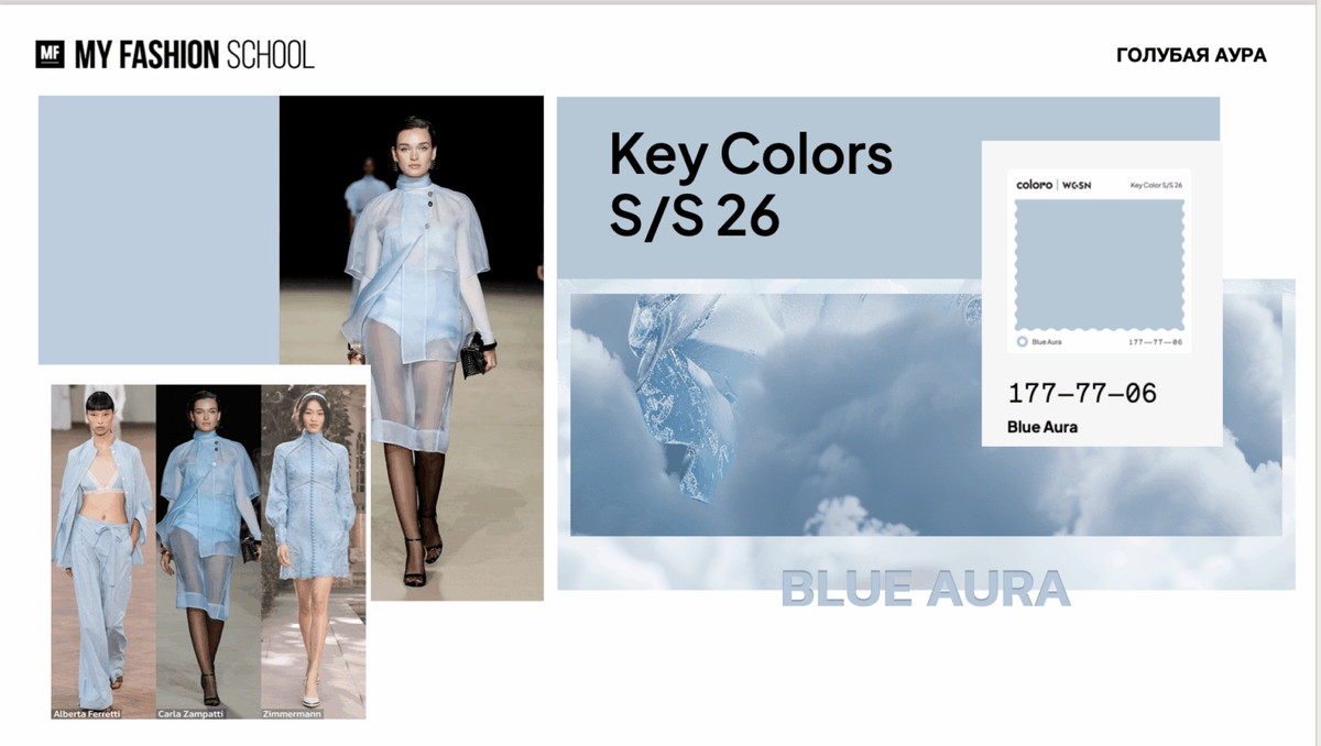 Хоть я и люблю его всем сердцем, но иногда у меня сводит зубы от этого бесконечного бежевого. Вся лента, весь пинтерест — сплошной овсяный кисель. Радует, что главный цвет 2026 (ну, хорошо, один из) — это ледяной голубой или Blue Aura (Голубая Аура). И нет, это не просто очередной оттенок. Это новый нейтральный, который пришел, чтобы подвинуть с пьедестала беж и серый. Он как глоток морозного воздуха в душном офисе — освежает, бодрит и повышает статус всего образа. Давайте разберемся, как носить этот минус так, чтобы быть в плюсе, и не выглядеть как снежинка на детском утреннике. Вся эта ледяная история активно гуляет на главных подиумах мира. Просто посмотрите на коллекции Tory Burch или Chloé — там этот цвет повсюду. Официальная пара для этого голубого — цвет Cloud Dancer (тот самый Облачный танцор, да). Это сочетание, которое говорит о дороговизне без единого логотипа. Так, с теорией разобрались, переходим к практике. Скупать все подряд не придется. Я составила список самых удачных