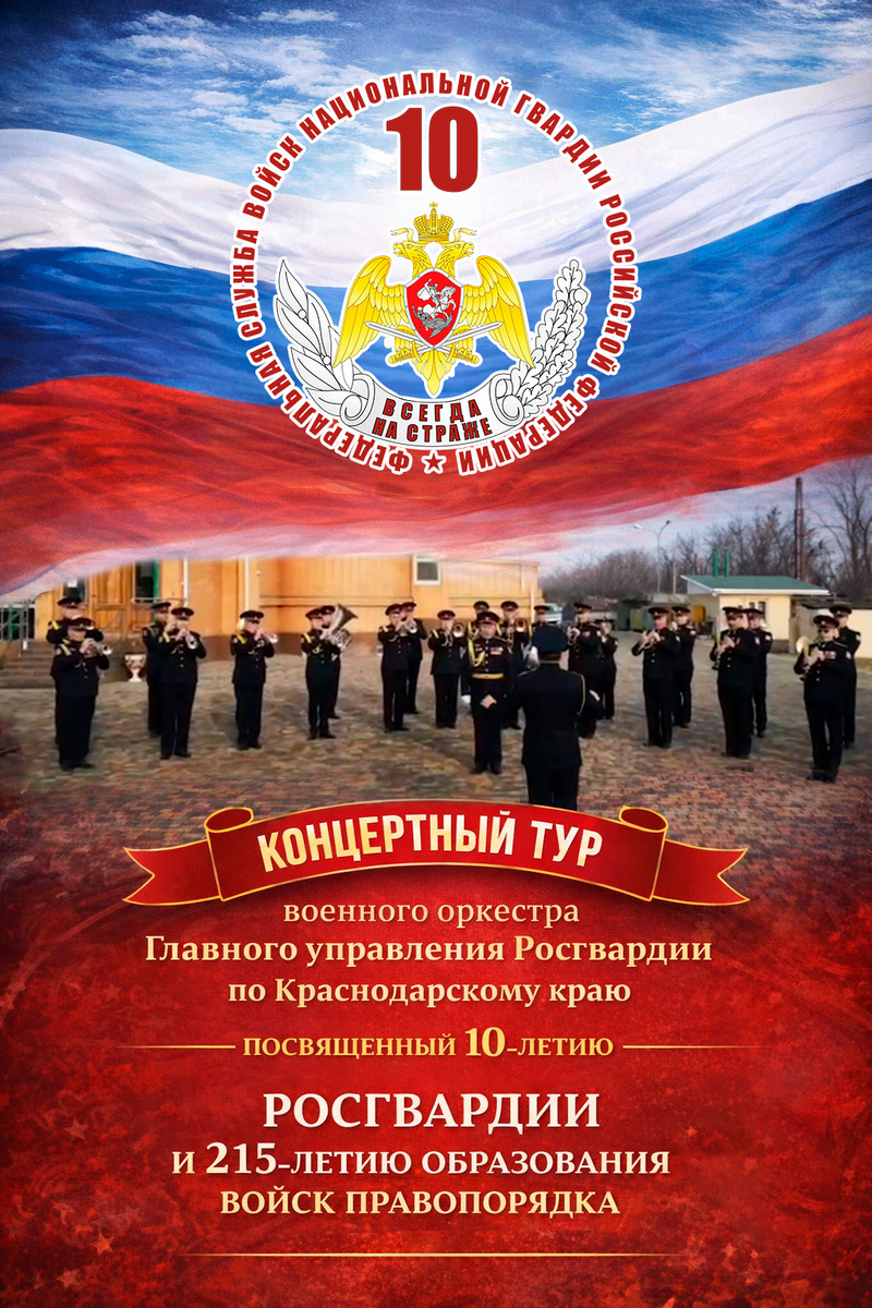 В Краснодарском крае стартует гастрольный тур военного оркестра регионального управления Росгвардии, приуроченный к 10-летию ведомства и 215-й годовщине войск правопорядка. Для жителей региона военные музыканты подготовили специальную концертную программу, в которую вошли военно-патриотические и эстрадные композиции. Под руководством дирижера майора Евгения Сонина коллектив выступит более чем в десяти населенных пунктах Кубани. Маршрут гастролей включает Абинск, Гулькевичи, Ейск, Кропоткин, Крымск, Темрюк, Тимашевск, Тихорецк, Туапсе, Усть-Лабинск, а также станицы Кавказскую и Полтавскую. Первый концерт состоится уже завтра, 29 января, в 15:00 в городе Гулькевичи на сцене КДЦ «Лукоморье» (ул. Комсомольская, 80). Вход на все концерты свободный. Информация о датах, времени и местах выступлений будет публиковаться на официальных ресурсах регионального управления Росгвардии.