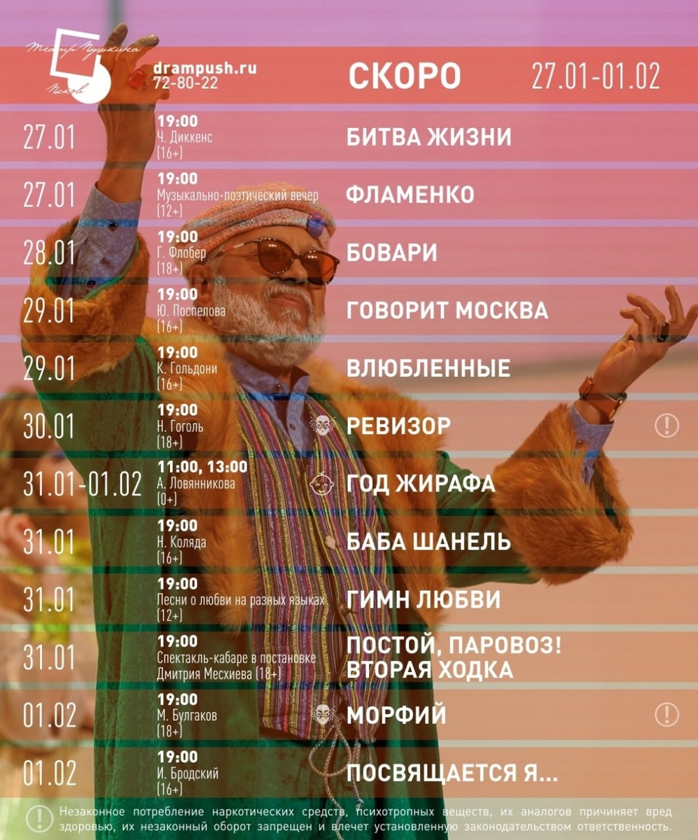А. С. Пушкина: 27 января – 1 февраля 🎭 😁 Зрителей ждут яркие комедии «Влюбленные» и «Баба Шанель», музыкальные вечера «Фламенко», «Постой, паровоз!» и «Гимн любви». Также в программе эмоциональные драмы «Битва жизни», «Бовари», «Морфий», «Говорит Москва», «Ревизор» и «Посвящается Я…». 🎈 Для самых маленьких — спектакль «Год Жирафа». Каждый найдет что-то интересное для души и ума. Оставайтесь с нами #НашаПсковскаяобласть
