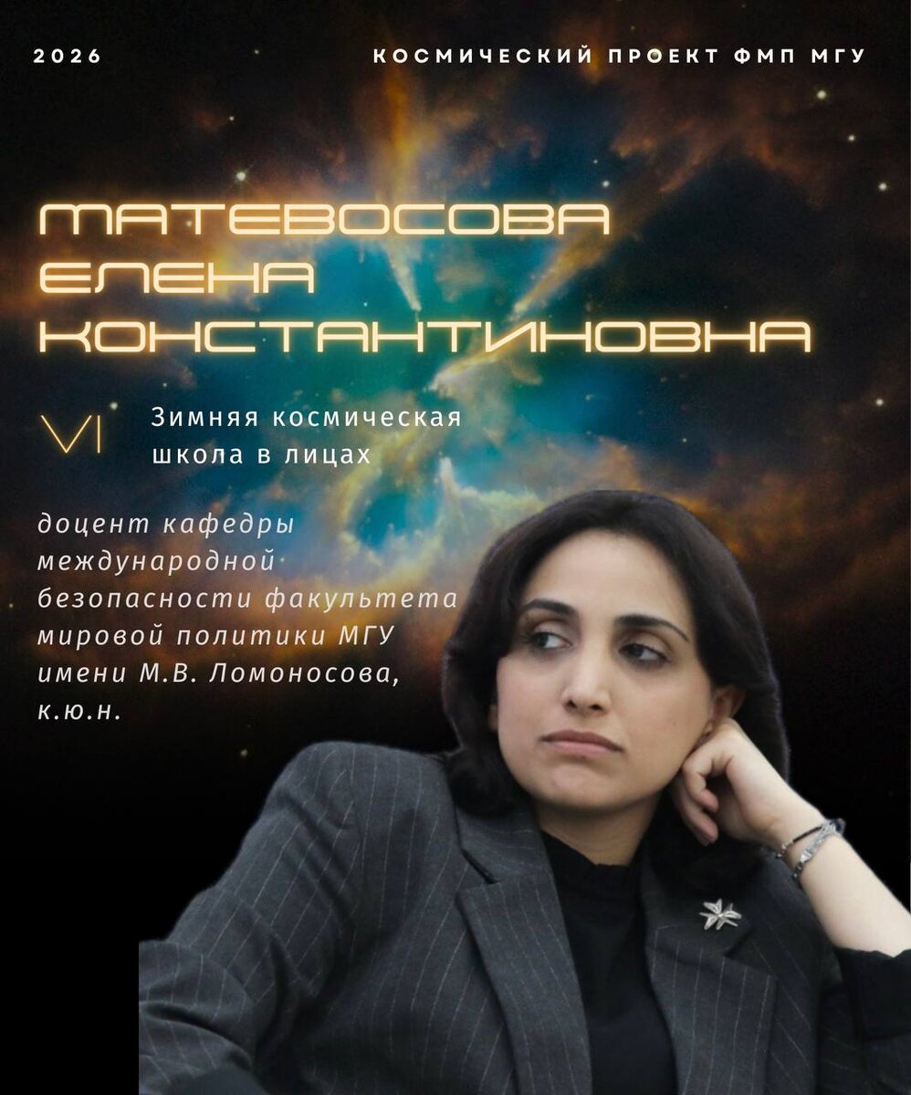 устойчивого развития, поскольку иначе невозможно создать более справедливый, инклюзивный мир — Е. К. Матевосова Сегодня мы с радостью представим вам замечательного эксперта VI Зимней космической школы — Матевосову Елену Константиновну! 👨🚀 Елена Константиновна — кандидат юридических наук, доцент кафедры международной безопасности факультета мировой политики МГУ, доцент кафедры теории государства и права Университета имени О.Е. Кутафина (МГЮА), действующий адвокат. Также Елена Константиновна входила в состав экспертной группы по космическим ресурсам Совета по космосу РАН, не раз была приглашенным экспертом наших предыдущих Зимних космических школ и научно-исследовательских семинаров. Научные интересы эксперта лежат в плоскости международной безопасности и охватывают сферу безопасности космического пространства. 📃 Предлагаем ознакомиться с публикациями Е. К. Матевосовой по космической тематике: «Модели правового регулирования деятельности по использованию космических ресурсов»,