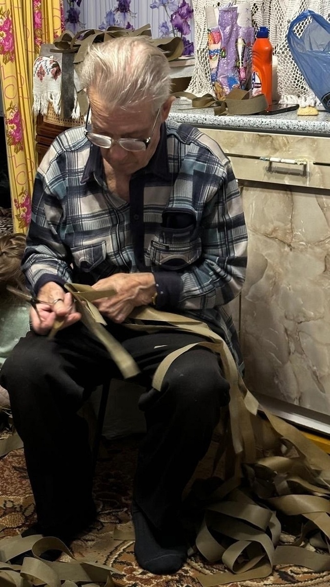 В администрации Иглинского района рассказали о необычном волонтерском тандеме, помогающем бойцам приближать победу. В деревне Бибахтино 92-летний Юсуп Балхияров готовит материалы для изготовления маскировочных сетей, а в напарниках у него 4-летний правнук Эмиль Фахретдинов. Несмотря на возраст, и стар, и млад справляются со своим делом весьма сноровисто. Дедушка аккуратно раскладывает материал и нарезает его на ленты, из которых местные мастерицы потом сплетут сети. Маленький Эмиль помогает отливать окопные свечи. Кроме того, семья помогает волонтерскому штабу и финансами. Фото: администрация Иглинского района.