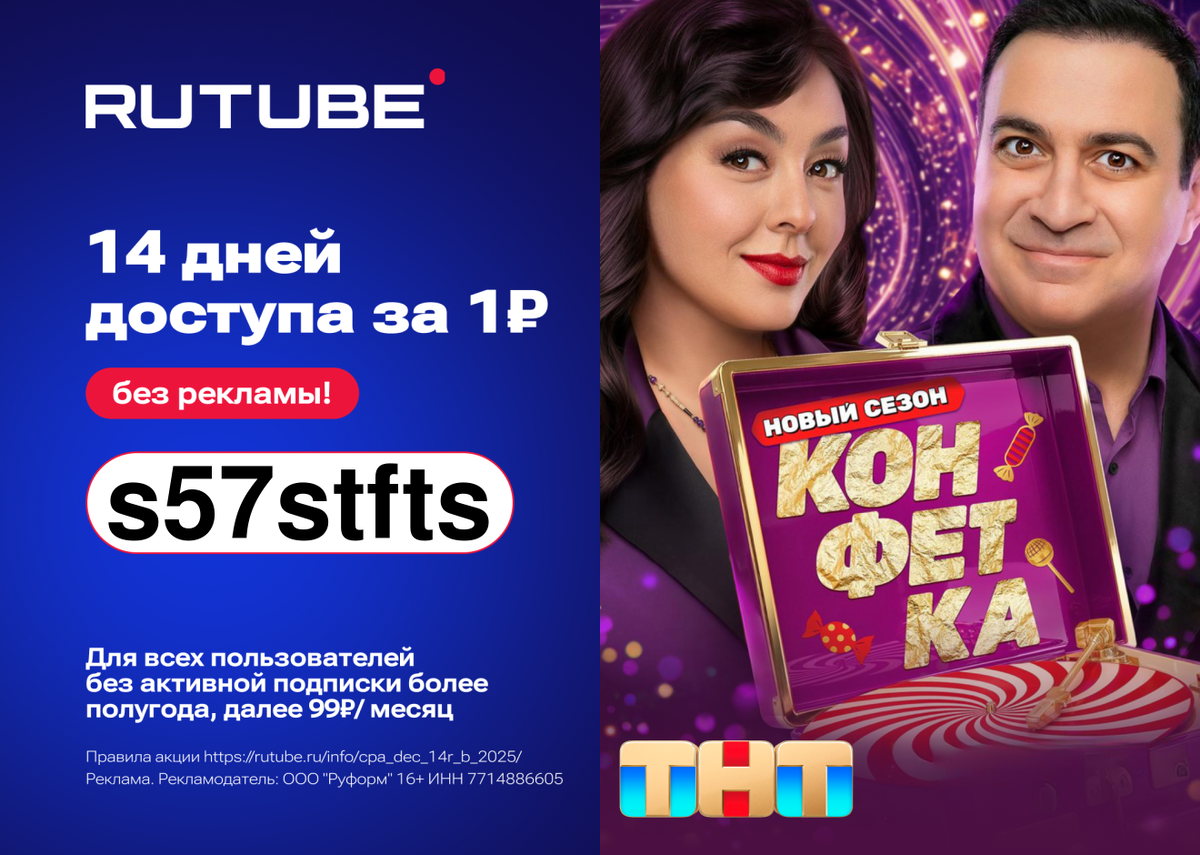 s57stfts , который дает 14 дней* за 1 ₽ доступа к RUTUBE без рекламы!