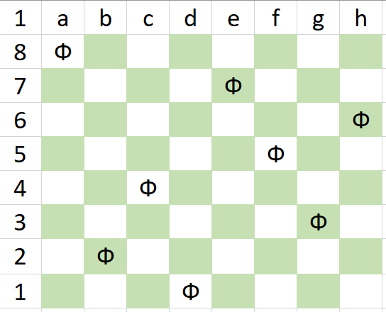 Всем привет, меня зовут Андрей, это снова я. Есть знаменитая задача о восьми ферзях. Надо расставить 8 ферзей на шахматной доске так, чтобы они не угрожали друг другу, чтобы они контролировали все поля шахматной доски. Данная задача имеет ровно 92 решения. В данной статье я показываю решение № 1 этой задачи. Вот картинка в Эксель: Вот картинка на шахматной доске с белыми ферзями: А вот эта же картинка с черными ферзями: А на этом пока всё, всем пока, и до новых встреч!