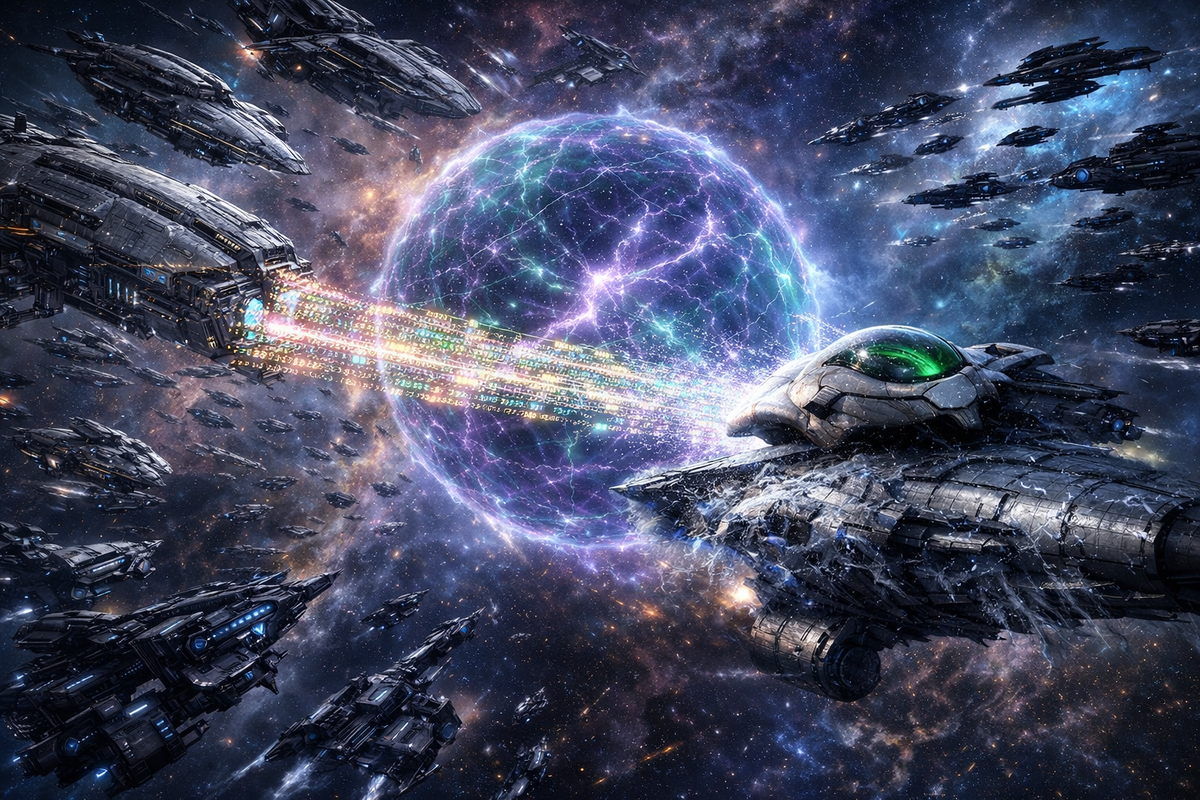 Корабли «Правды» развернулись, образовав геометрически безупречную сферу вокруг сектора, где находились мы и АКПЕР. «Атласовцы» на время замерли на периферии, наблюдая — эффективно, как стервятники, ждущие ослабления жертвы. Затем с флагмана «Правды», «Догмата», ударил не луч, а пакет данных. Сверхнасыщенный, сжатый нарративный импульс. Он прошёл сквозь наши щиты, как радиация сквозь бумагу. Щиты были настроены на энергию, а это была чистая информация. Инфекция.