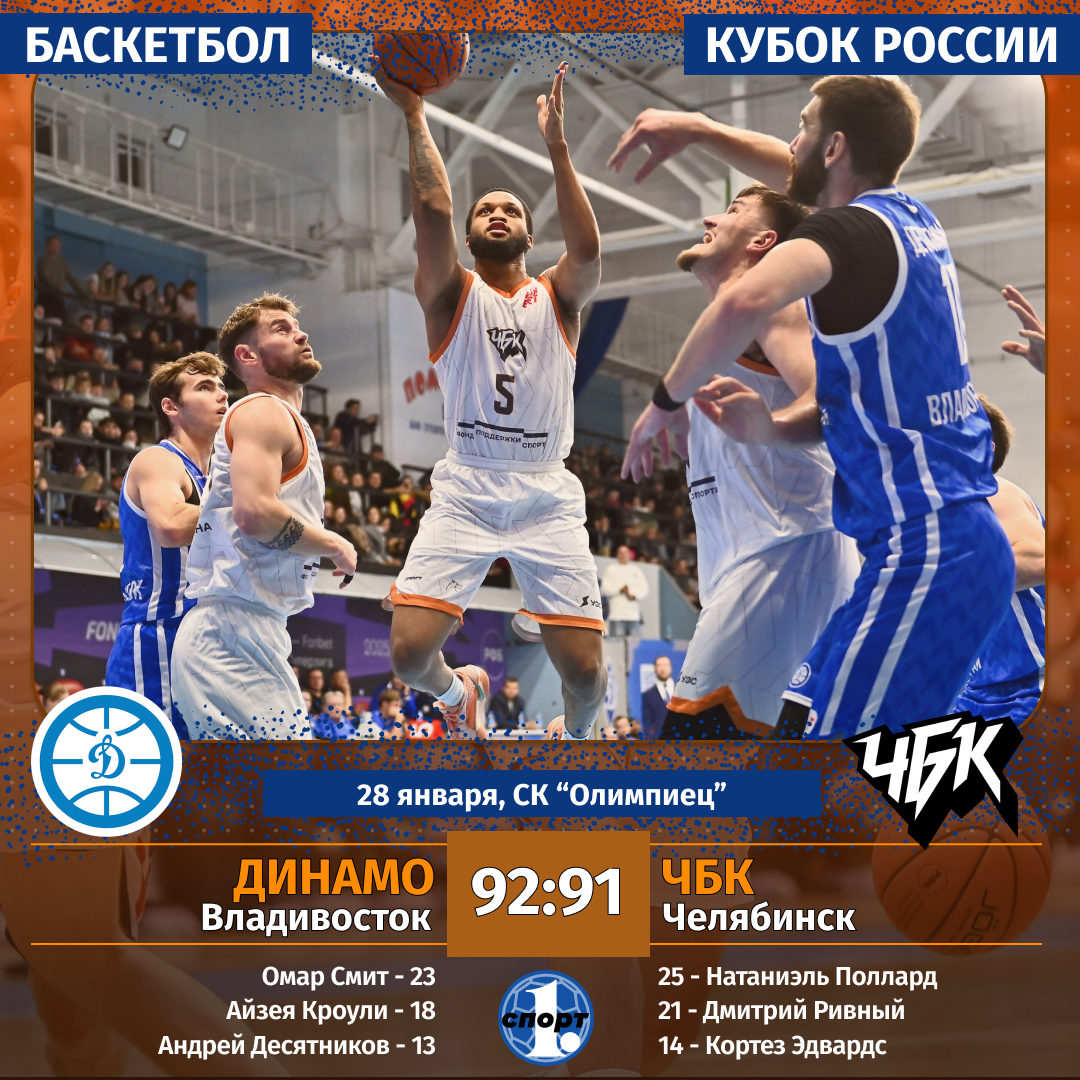 Баскетбол. Сезон-2025/2026. Кубок России. Мужчины. Четвертьфинал. Ответный матч. 28 января. «Динамо» (Владивосток) — «ЧБК» (Челябинск) — 92:91 (22:28, 22:24, 29:17, 19:22).