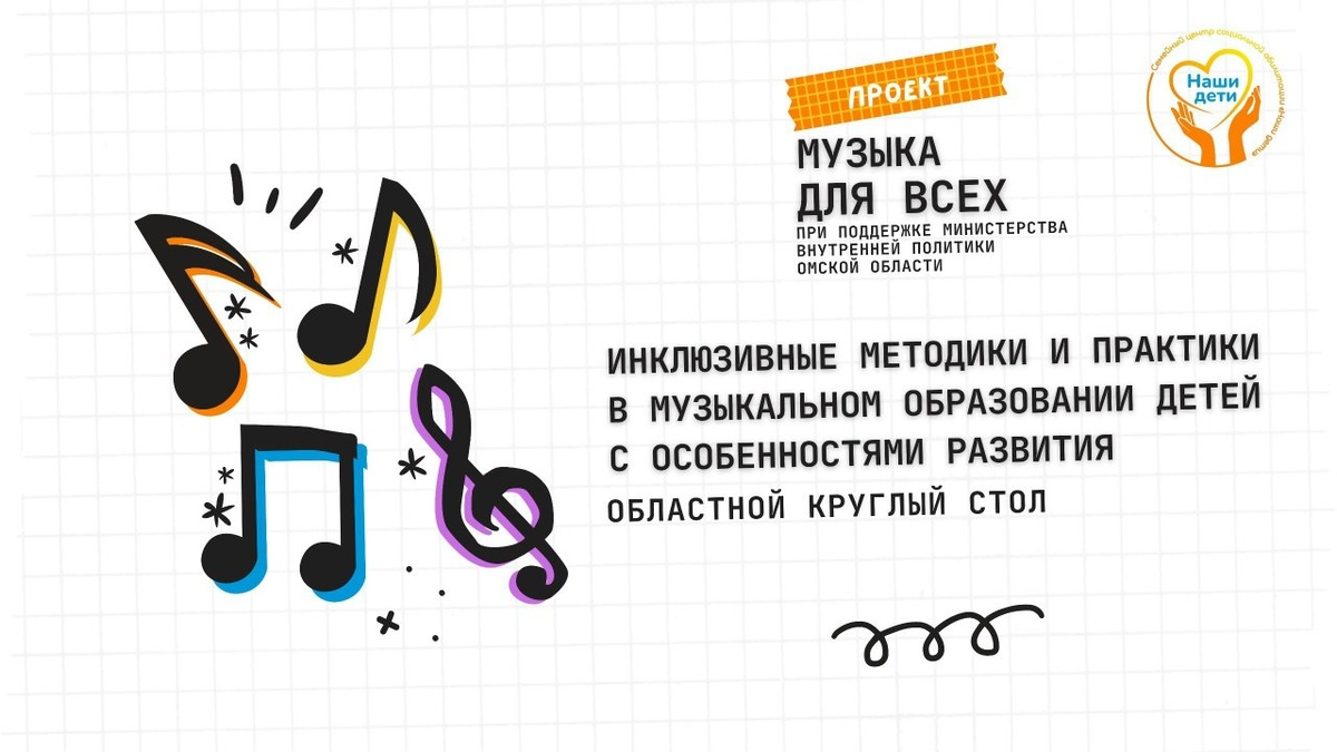 мир музыки доступным каждому ребёнку. 🎼 Цель мероприятия: обсудить инновационные подходы и поделиться опытом в области музыкального образования детей с особыми образовательными потребностями. 🔹 Архитектура программы круглого стола: - Торжественное открытие. Приветствие организаторов и партнёров проекта. - Панельная дискуссия. Обсуждение вопросов внедрения инклюзивных методик в систему музыкального образования региона. - Выступления педагогов-практиков. Спикеры поделятся успешными кейсами и методами обучения музыке детей с особыми образовательными потребностями. - Награждение участников. ❗ Участие бесплатное, но количество мест ограничено. Для регистрации заполните анкету по следующей ссылке до 10 февраля 2026 года: https://clck.ru/3RNWNj Напомним, что Круглый стол состоится в рамках проекта "Музыка для всех", при поддержке Министерства внутренней политики Омской области.