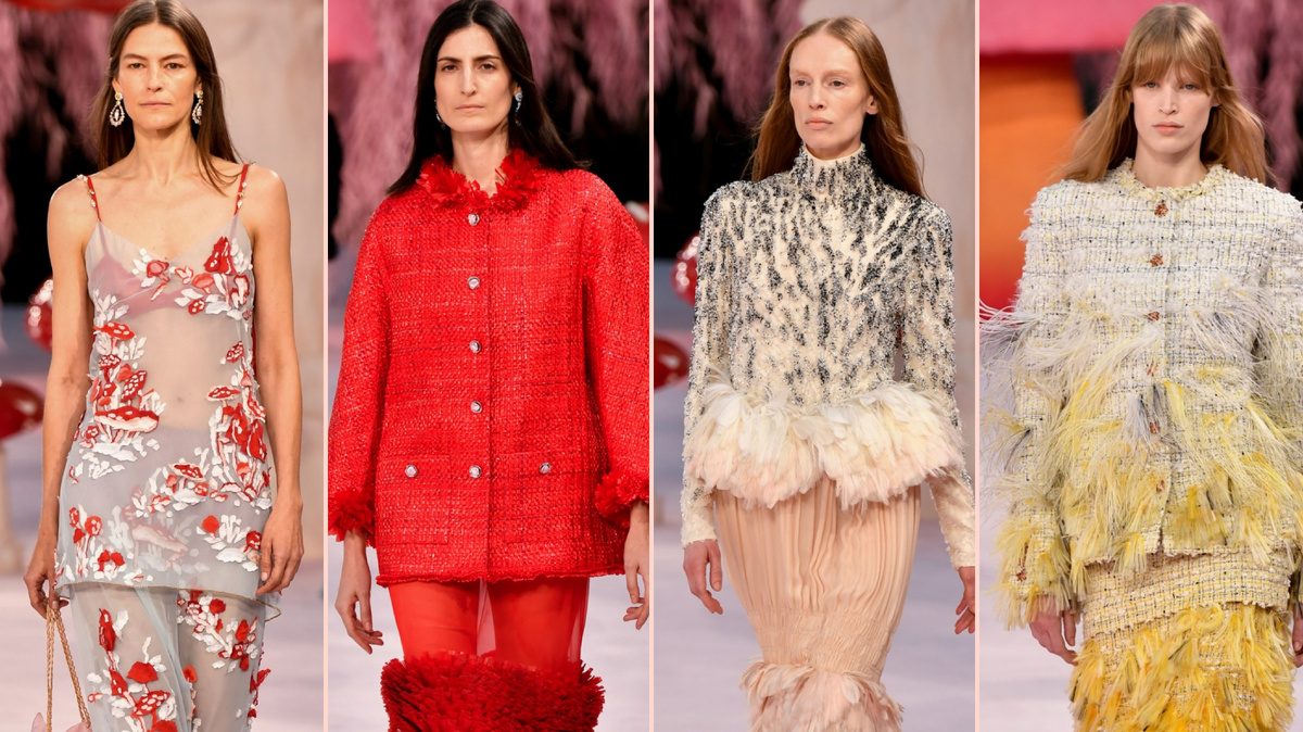 Матье Блази нашел противоядие от тяжести ожиданий, связанных с его дебютом в мире высокой моды Chanel: волшебные грибы. Его бледно-розовое шоу в Гран-Пале было усеяно гигантскими грибами - приятным контрастом с серым небом за окном. Дизайнер заинтриговал зрителей анимационным фильмом, в котором лесные животные работают в мастерской Chanel в стиле "Золушки". "Я хотел чего-то легкого, поэтичного и легко понятного", - сказал Блази в предварительном просмотре. "Создание чего-то легкого также позволяет мне снизить драматизм". С коллекцией, нежной как весенний ветерок, он осторожно приступил к сложной задаче переосмысления самых узнаваемых кодов моды 20-го века. Блази открыл показ с шифоновой версии классического твидового костюма Chanel, прозрачные слои которого едва скреплялись тоненькими цепочками и жемчужинами, вшитыми в подолы. На модели Стефани Кавалли, итальянской модели за сорок, костюм дополняла легкая стеганая сумочка, из которой выглядывала вышитая записка. Из