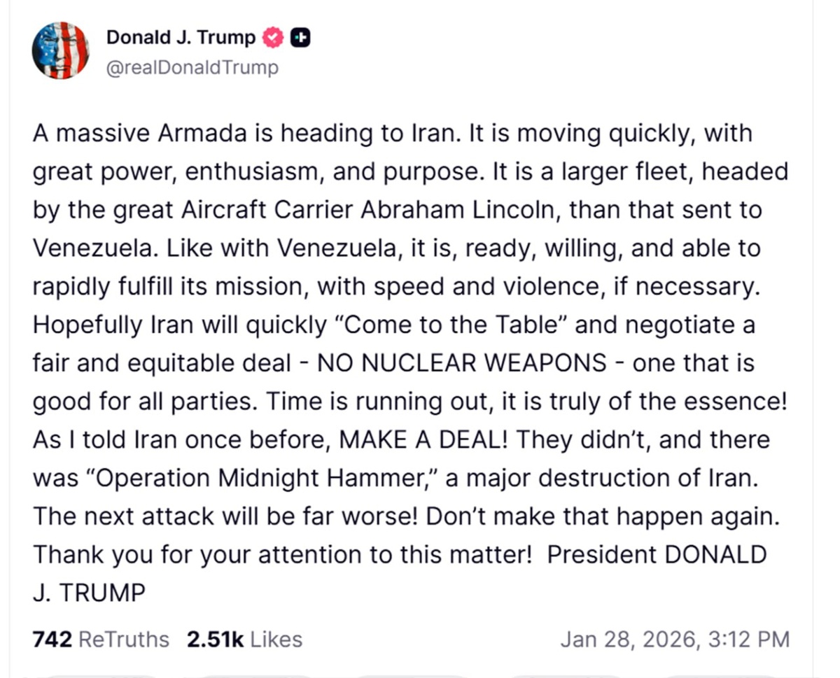Трамп потребовал от Ирана отказаться от ядерного оружия и пригрозил более мощными ударами, чем в прошлом году. «Огромная армада направляется к Ирану. Она движется быстро, с огромной мощью, энтузиазмом и целеустремлённостью. Это более крупный флот, возглавляемый великим авианосцем „Авраам Линкольн“, чем тот, что был отправлен в Венесуэлу. Как и в случае с Венесуэлой, он готов, желает и способен быстро выполнить свою миссию, при необходимости применив скорость и насилие. Надеюсь, Иран быстро сядет за стол переговоров и заключит справедливую и равноправную сделку — без ядерного оружия — сделку, выгодную для всех сторон. Время на исходе, это действительно имеет решающее значение! Как я уже говорил Ирану ранее: заключите сделку! Они этого не сделали, и произошла операция „Полуночный молот“, масштабное разрушение Ирана. Следующая атака будет намного хуже! Не допустите повторения этого», — написал Трамп. #США #Иран Военный Осведомитель