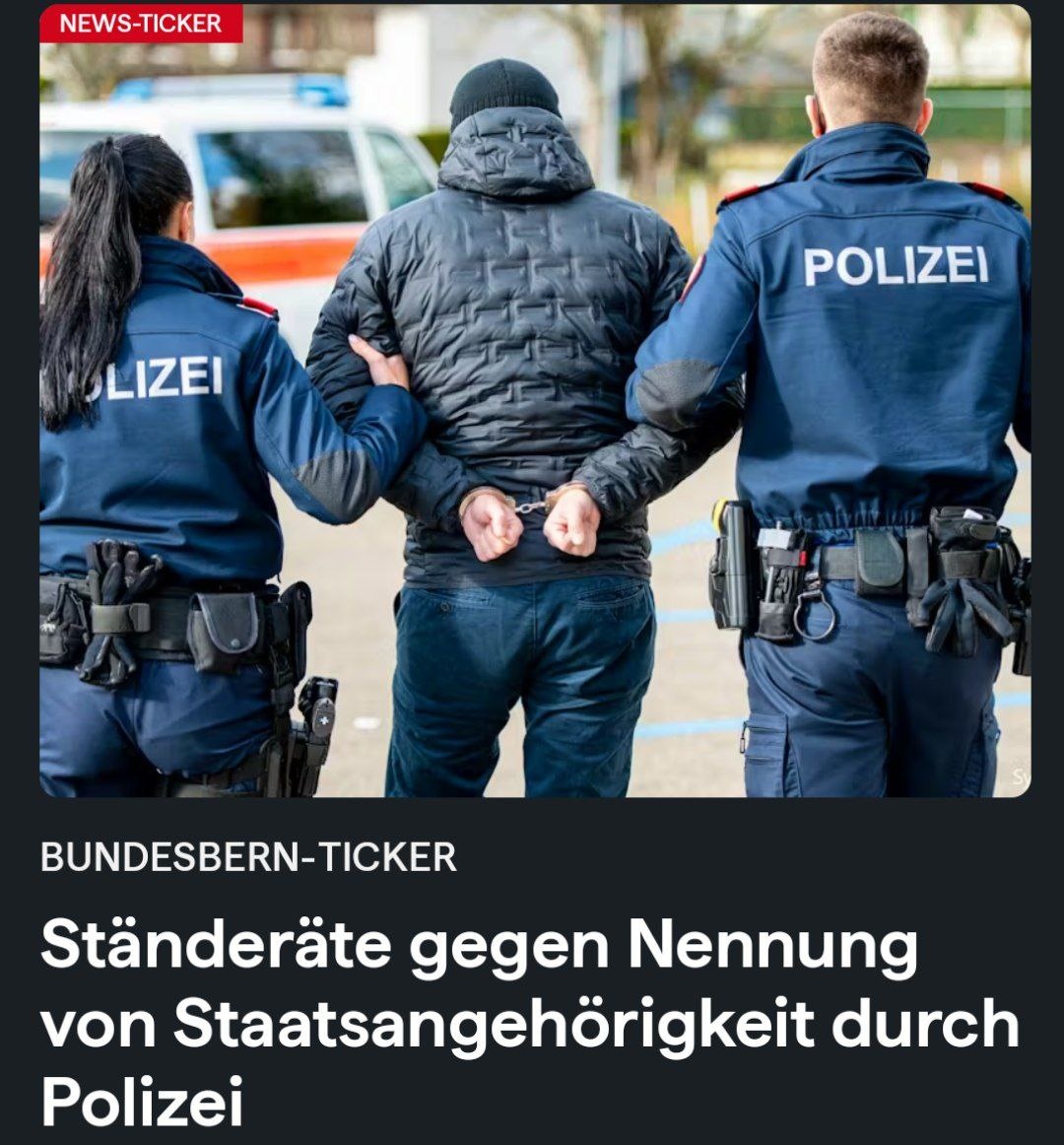 . Раз уж поймали " зайца " в автобусе ,всем нужно знать его гражданство 🫡 "Не указывать гражданство в полицейских сообщениях Комиссия по правовым вопросам Совета кантонов отклонила требование об обязательном указании возраста, пола и гражданства в полицейских сообщениях — причём с минимальным перевесом. Решение было принято при равенстве голосов шесть к шести, а решающим стал голос председателя комиссии Андреа Карони (СвДП/АР). В обосновании говорится: «Комиссия считает нецелесообразным предписывать правоохранительным органам, какие именно данные о подозреваемых они обязаны сообщать». При этом она приветствует тот факт, что такие сведения впоследствии содержатся в полицейской статистике преступности, а также в статистике уголовных приговоров Федерального статистического ведомства"