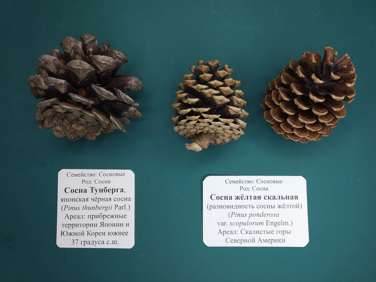 Моя коллекция пополнилась двумя видами сосен, шишки которых мне передали сотрудники Ботанический сад МГУ имени М.В. Ломоносова на выставке "Шишки, хвоя и не только". Сосна Тунберга, её ещё называют японская чёрная сосна (Pinus thunbergii). Ареал: прибрежные территории Японии и Южной Кореи южнее 37 градуса с.ш. С систематикой второй пришлось повозиться. То она была как отдельный вид, то подвид, то разновидность сосны жёлтой. И, похоже, так и не пришли к единому мнению.