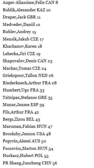 🎾 В списке: Феликс Оже-Альяссим Александр Бублик Джек Дрейпер Даниил Медведев Андрей Рублев Якуб Меншик Карен Хачанов Иржи Лехечка Денис Шаповалов Томаш Махач Таллон Грикспур Артур Риндеркнех Уго Умбер Стефанос Циципас Хауме Мунар Артур Филс Зизу Бергс Фабиан Марожан Дженсон Бруксби Алексей Попырин Мартон Фучович Хуберт Хуркач Чжунчэн Шан Запасные: Валентин Ройер Камил Майхшак Чжичжэнь Чжан Джованни Мпетши Перрикар Адриан Маннарино Рафаэль Коллиньон Йеспер де Йонг Ботик ван де Зандшульп Александар Вукич Квентин Гали Подпишись на Эйс и точка