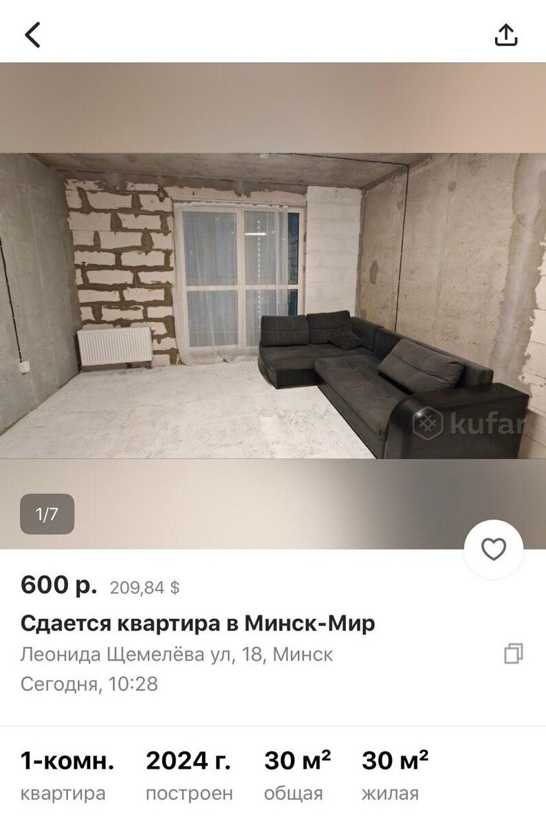 На Kufar появилось объявление о сдаче квартиры без отделки за 600 рублей в месяц.