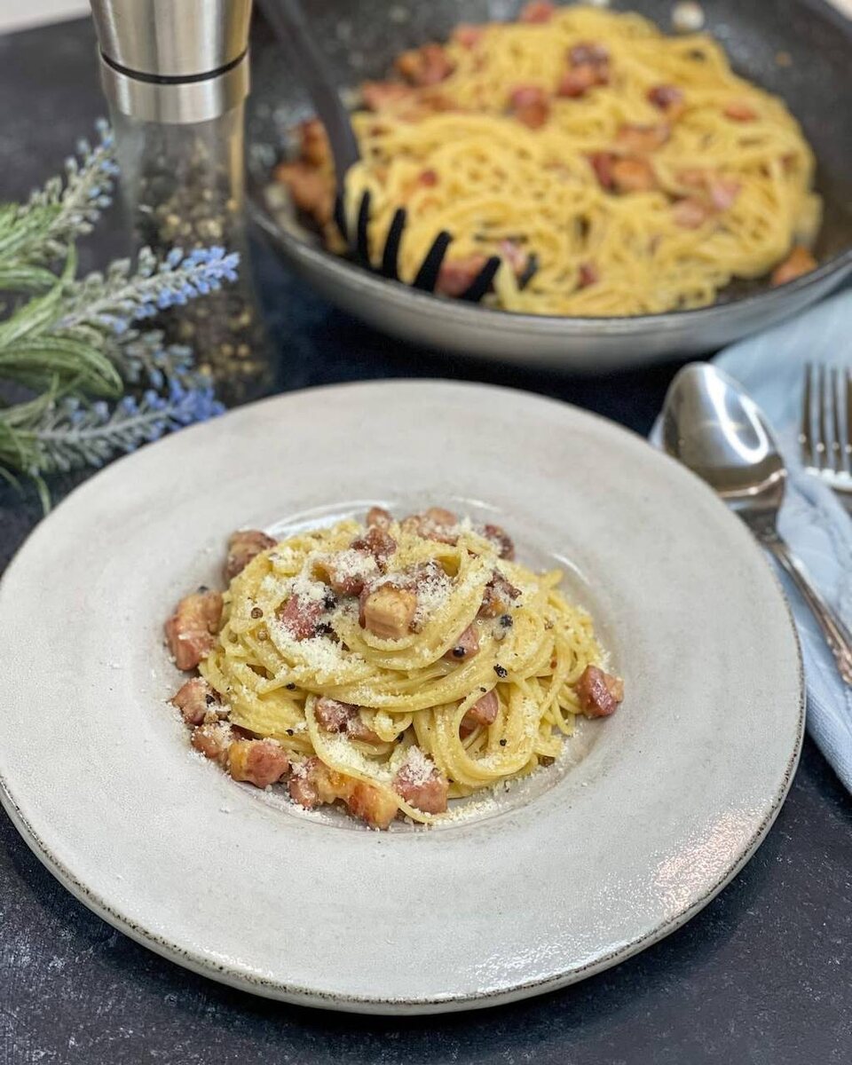 Карбонара это максимально простое блюдо, нам понадобится всего три главных компонента! Сливок в итальянской версии карбонары нет, готовим максимально приближенно к римской версии из наших продуктов. Ингредиенты на 2 большие порции: ✔️паста спагетти 150 гр ✔️варено-копченая грудинка (или гуанчале) 350 гр, самая подходящая от производителя Горки ✔️пармезан/пекорино очень мелко тертый 70-100гр ✔️2 яйца+1 желток (либо 3 желтка см ниже) ✔️3 зубчика чеснока ✔️2 ст ложки оливкового масла ✔️свежемолотый черный перец, соль Готовим: 📌нарезаем средним кубиком грудинку, чеснок давим, но не режем. На холодную сковороду с оливковым маслом выкладываем грудинку, чеснок и обжариваем помешивая на среднем огне, как вытопится весь жир и хорошо обжарится грудинка - удаляем чеснок. 📌паралельно ставим воду для пасты, солим, как закипит - отправляем пасту и варим до состояния альденте по инструкции и времени на упаковке. 📌взобьем вилкой яйца, чуть подсолим и добавим перца, добавим пармезан 3-4 ст ложки и