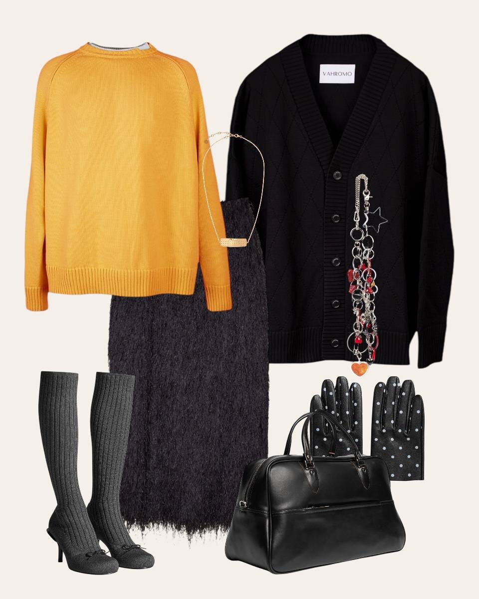Красивущий образ для красивого пятна на белом фоне сугробов Джемпер https://vahromo.ru/product/jumper-sota-yellow/ Кардиган https://vahromo.ru/product/cardigan-kurt-black/ Юбка https://vahromo.ru/product/ybka-holiday-black/ Перчатки https://www.ushatava.ru/catalog/odezhda/odezhda162/aksessuary145/ukorochennye-perchatki-v-goroshek/?offer=152106 Сумка https://www.ushatava.ru/catalog/odezhda/odezhda162/aksessuary145/sumka-bouler_1/?offer=151266 Обувь https://www.ushatava.ru/catalog/odezhda/odezhda162/obuv/sapogi-chulki-trikotazhnye/?offer=150882 Брелок на сумку https://www.km20.ru/catalog/product/180585/ Ожерелье https://www.km20.ru/catalog/product/179815/