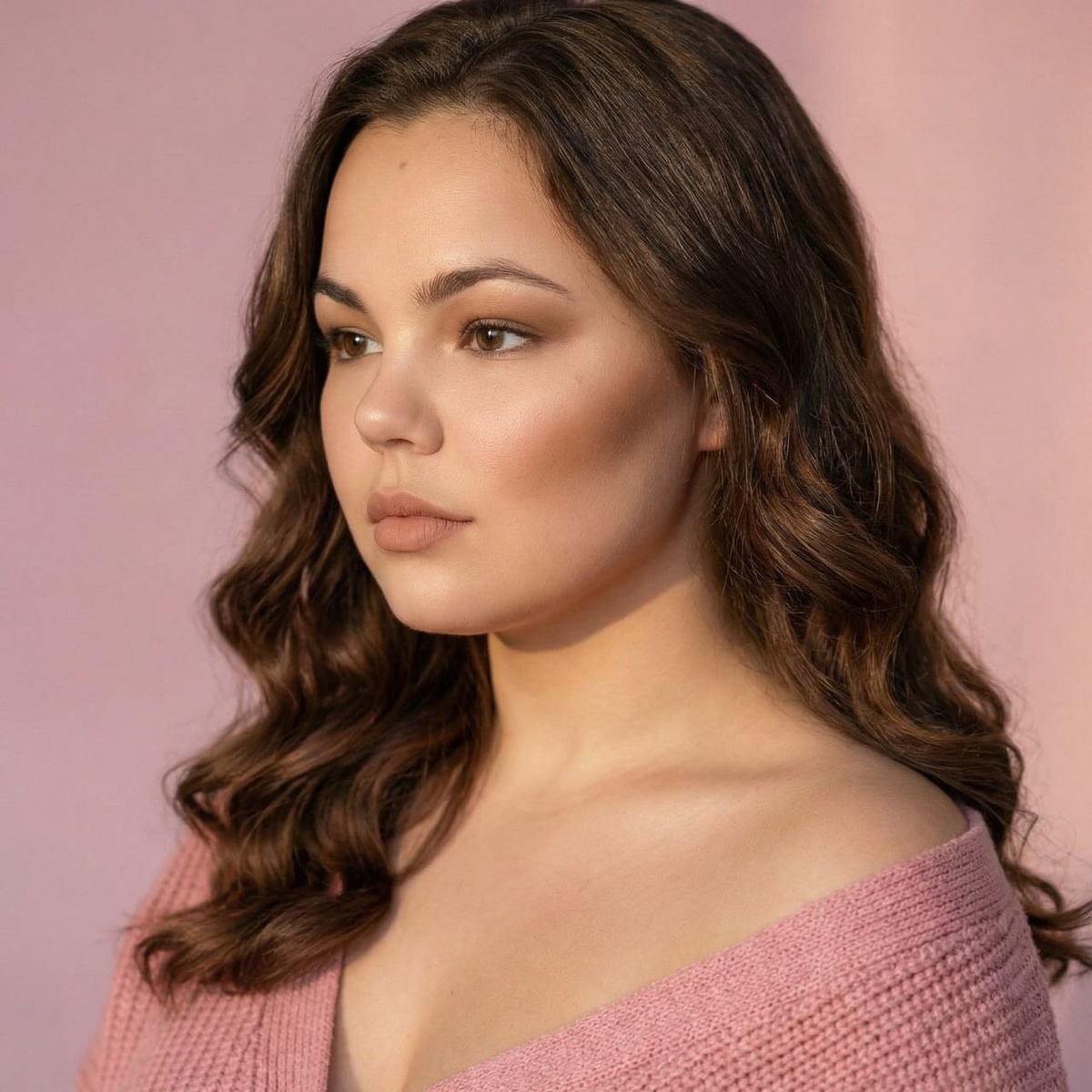 😀Выбираем "нейросети" 😀Нажимаем "Nano Banana" 😀Нажимаем "Nano Banana Pro" 😀Прикрепляем через скрепку свое фото и выбранный промпт 😀Наслаждаемся результатом😍 Создай фото не меняя черты лица. Макияж - нюд, контуринг. Акцент на скулах.Губы покрыты нюдовым оттенком помады. "Портрет молодой женщины в профиль/три четверти, длинные волнистые шоколадно-коричневые волосы с мягкими крупными локонами, свободный розовый вязаный свитер со спадающим плечом, заметное плечо и декольте, гладкая сияющая кожа, теплое кинематографическое боковое освещение, нежно-розовый фонео, высокая детализация волос и текстуры трикотажа, мягкая ретушь, теплые розово-золотые тона, shallow depth of field, реалистичная кожа и светотень, 85mm, f/1.8, ultra-detailed, photorealistic." Негативный промпт: "шум, артефакты, пересветы, грубая текстура, мультяшный стиль, исказившие пропорции." #портретные@annapromtii20 #женские@annapromtii20