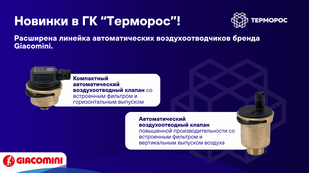 Рады сообщить о расширении линейки автоматических воздухоотводчиков Giacomini. Giacomini предлагает инновационную быстро разборную конструкцию, которая позволяет легко получать доступ к встроенному фильтру для его очистки и обслуживания клапана. Имеющийся колпачок с гигроскопической прокладкой на выпуске воздуха автоматически останавливает протечку. Воздухоотводчики Giacomini работают автономно, автоматически удаляя воздух из системы без участия человека, что особенно удобно в больших домах или сложных инженерных сетях, где ручное удаление воздуха было бы затруднительно. Они решают проблему скопления воздушных пробок, которая влияет на долговечность и эффективность работы тепловых систем. Воздухоотводчики устанавливают в самой высокой точке системы, где могут образовываться воздушные карманы. Под заказ уже доступны: Уточняйте подробности и оформляйте заказы у персонального менеджера!