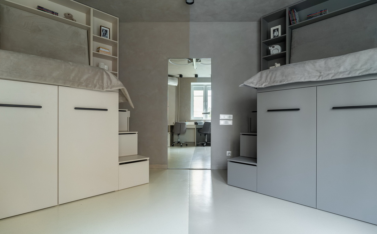 С одной стороны, тут все учтено. Две кровати, два рабочих места, много свободного пространства. С учетом того, что помещение нестандартное, решение кажется оптимальным.