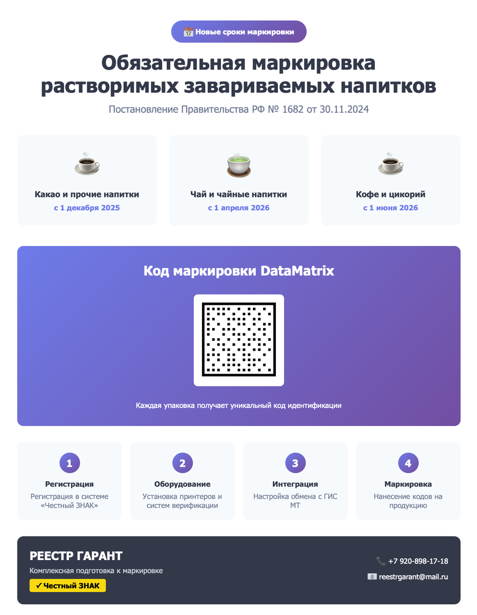 Компания «Реестр Гарант» предоставляет комплексные услуги по подготовке к маркировке чая и кофе:
