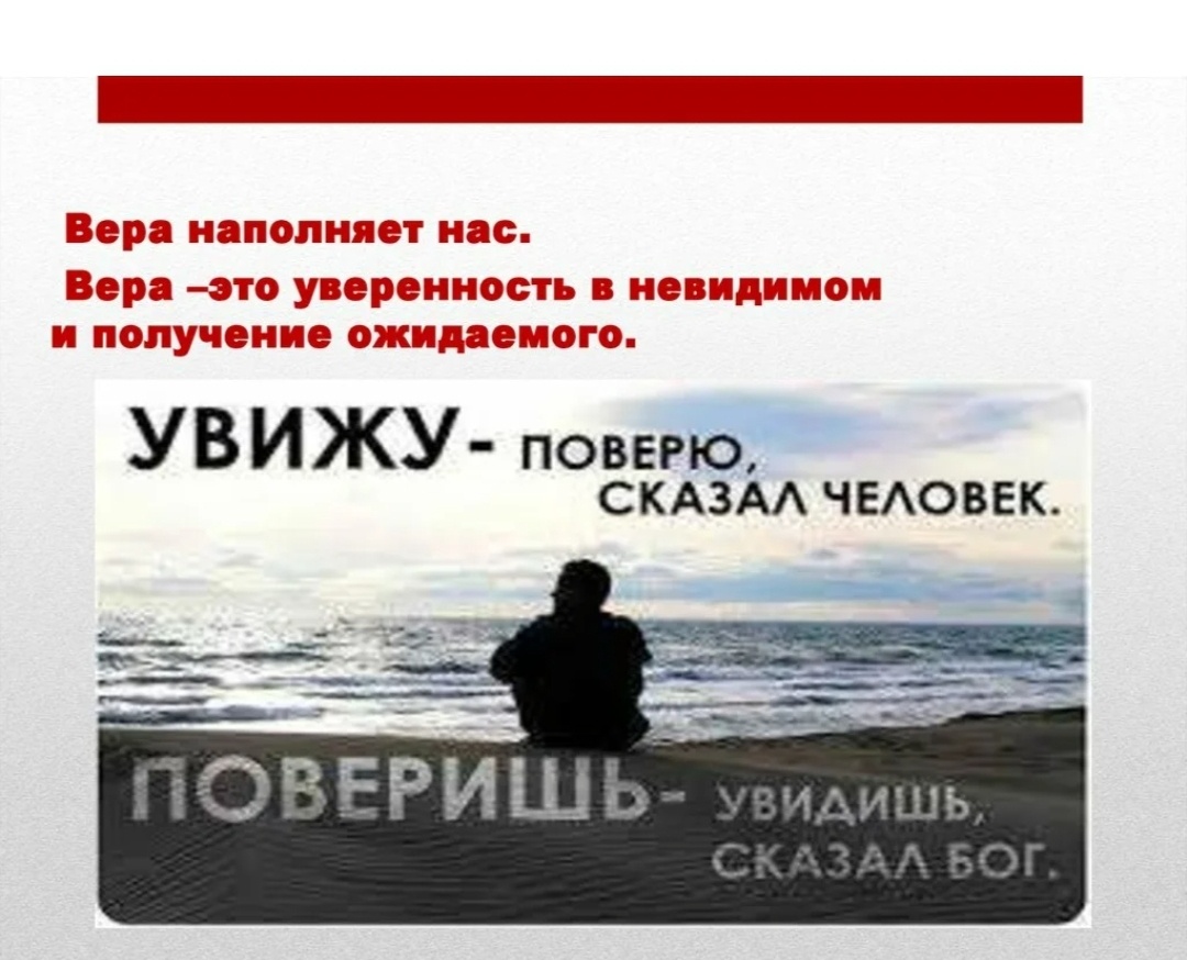 Вера, это чувство, а чувство всегда предшествует действию. Без чувства веры в себя человек не сможет и шагу ступить. Наглядный пример такой веры – это ребенок, который учится ходить. Пока он не поверит, что сможет удержать равновесие, он будет падать. Это вера в свои неосознанные силы. Как только эти силы будут осознаны, они выходят из области непроявленного и становятся явью. Тут нет никакого чуда, так как способность к обучению заложена в программе души. И в то же время, мы радуемся первым шагам ребенка, как чуду. Вчера еще боялся и не умел, а сегодня уже преодолел свой страх и пошел. Преодоление своих страхов - вот настоящее чудо, но без веры в себя оно не свершится. Понятно, что проявление новых способностей каждого отдельного человека ограничено программой телесной и программой, по которой живет общество. Если с детства внушать ребенку, что он может взлететь, ребенок все равно не взлетит, но может научиться высоко прыгать как вверх на батуте, так и вниз, например с парашютом. А