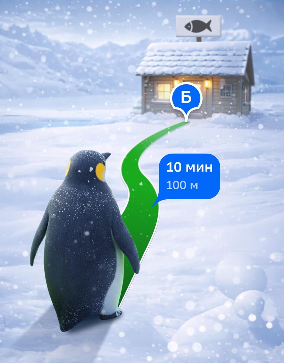 Разгадка есть: пингвин решил взять рыбу для друзей, построил маршрут в 2ГИС и дошёл с пешим навигатором 💚
