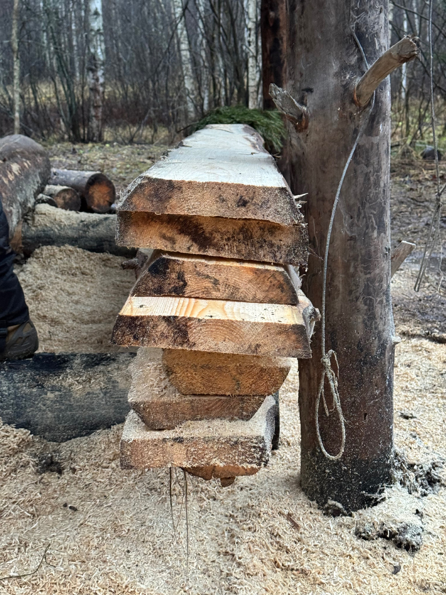 На следующей неделе я приехал в лес один. Цель была чёткая и понятная — прострогать все доски для пола. Да, после распуска они получились почти идеальными, но для нормальной укладки их всё равно нужно было довести до ума. И сделать это нужно было именно сейчас, до выходных, потому что на выходные и так было много планов.