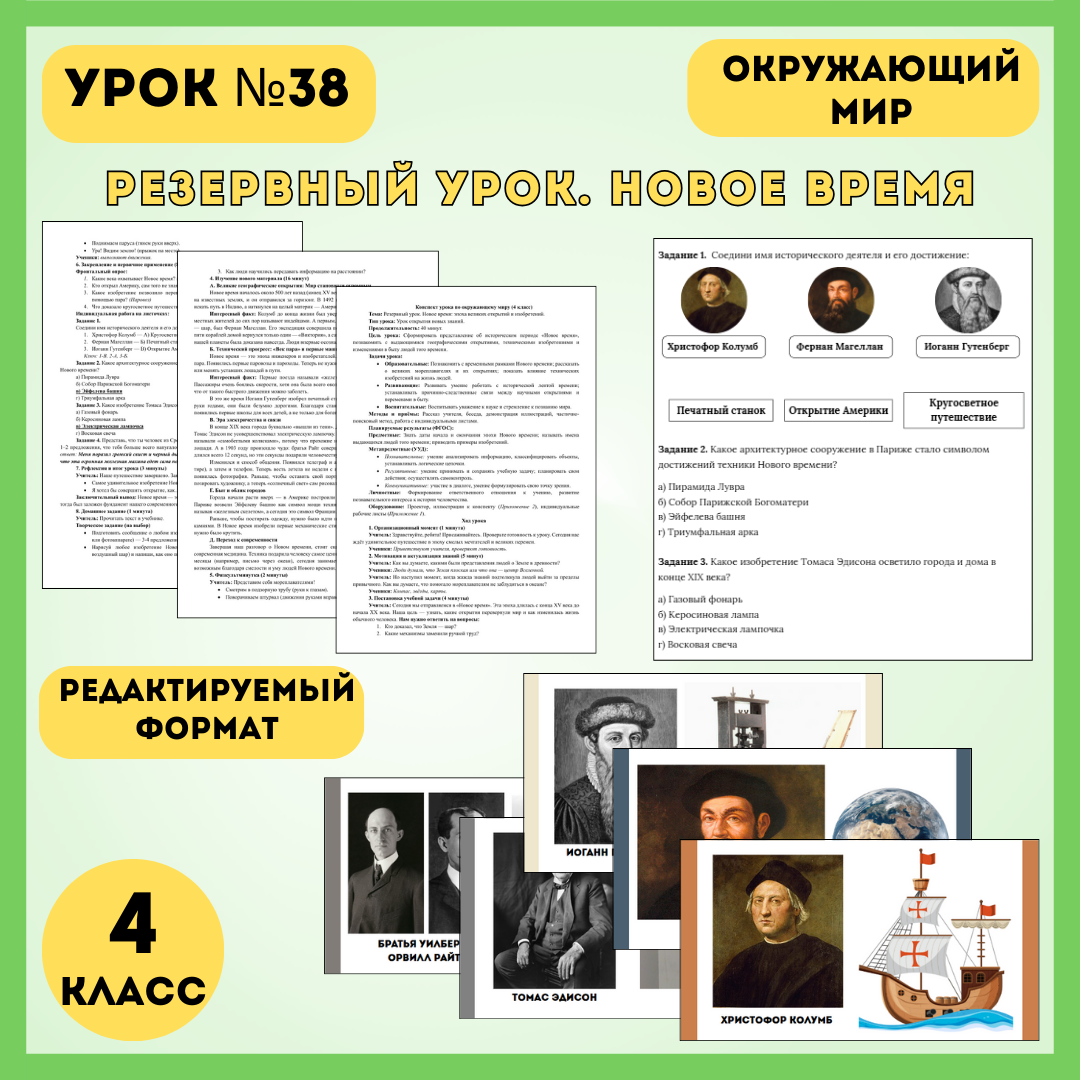 Как уместить несколько веков великих открытий и невероятных изобретений в один школьный час? Новое время — это, пожалуй, самый «кинематографичный» период истории, который дети обожают за дух приключений, отважных мореплавателей и первых гениальных инженеров. Чтобы ваш резервный урок №38 прошел не просто «для галочки», а стал настоящим погружением в прошлое, я подготовила полностью готовый методический комплект. Именно в этот период мир стал таким, каким мы его знаем. Мы до сих пор пользуемся плодами достижений той эпохи: от электрической лампочки до телефона. На уроке в 4 классе важно показать детям связь времен: как маленькое изобретение когда-то изменило жизнь миллионов людей. Я разработала конспект, который превращает обычный урок в историческую экспедицию. Вот что в нем есть: Вам не нужно тратить вечер на составление плана или поиск картинок. В комплекте на Инфоуроке вы найдете: В конце урока я предлагаю детям подумать: «Какое изобретение Нового времени вы считаете самым важным?».
