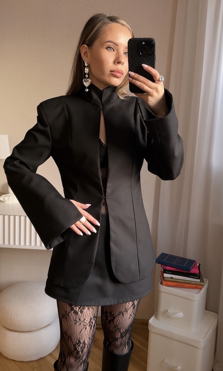 📍Чёрный костюм с приталенным жакетом и очень классной, необычной застёжкой.