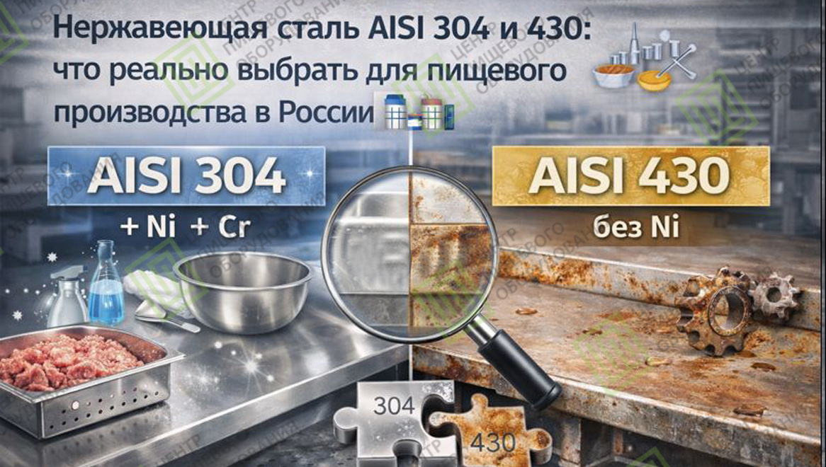 А теперь — по порядку. AISI 304 — золотой стандарт пищевой промышленности 🥇 AISI 304 — это аустенитная нержавеющая сталь с высоким содержанием никеля и хрома. 🔬 Что это даёт на практике: Где обязательно нужна AISI 304: 📌 Именно AISI 304 чаще всего ожидает увидеть Роспотребнадзор. AISI 430 — разумная экономия, но с условиями ⚖️ AISI 430 — ферритная нержавеющая сталь без никеля. Её реальные свойства: Где AISI 430 допустима: 💡 Важно: при правильном применении AISI 430 не является нарушением, но требует гра