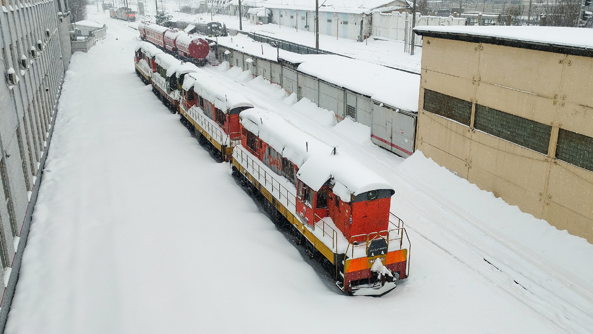 Кстати, оказался я как раз таки на одной из крупнейших станций Москвы - Люблино-Сортировочное. К слову, не был я в этих местах уже очень давно. Станция огромная, работы на ней обычно ещё больше, но вот в этот раз не задалось как-то. Проходя по пешеходному мостику рядом с платформой Депо в глаза первым делом бросились сплотки спрятанных под снегом тепловозов.