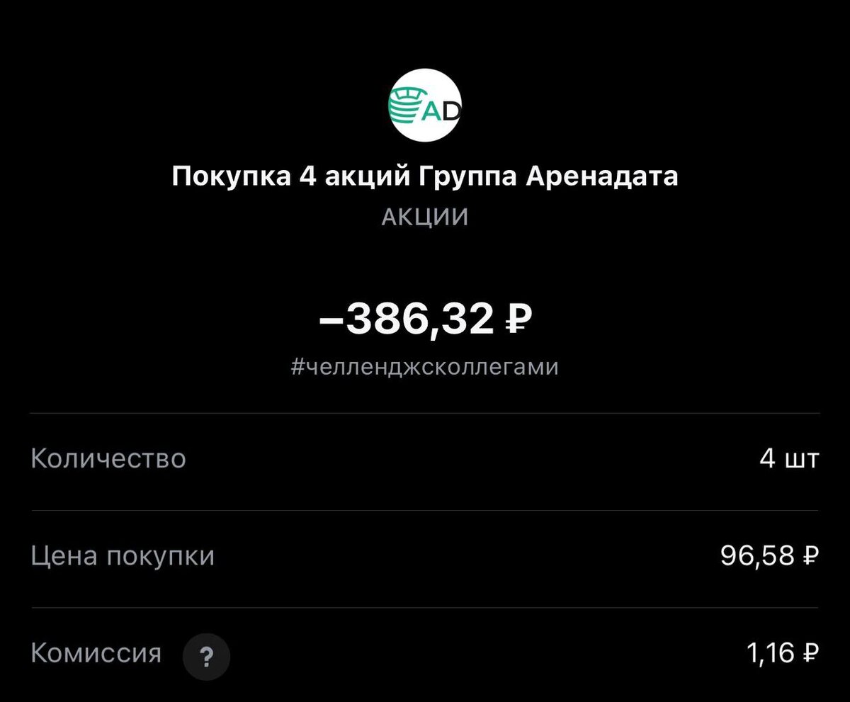 ! Покупка на сегодня #356 многим пришли дивиденды от Роснефть, тратим всю сумму. Статистика портфеля на стороннем сервисе, можно посмотреть по "ссылке" Напомню это челлендж с коллегами, каждый рабочий день пополняем брокерский счет на 250 рублей и инвестируем. Если возникли вопросы или есть не понимание, что делать. Задавайте «тут» Покупка #356 🟢 "Аренадата" 96.58 rub #DATA 4 лота #каждыйсможет #челенджсколлегами ✈️ Стас Мироненко