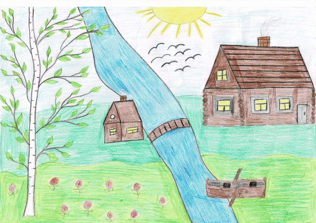 Описание работы: Рисунок к стихотворению Н. М. Рубцова «Родная деревня» написанное в 1970 году. Выполнен цветными карандашами.