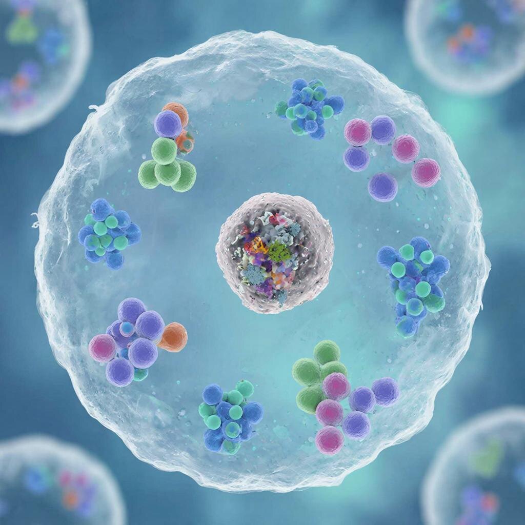 Ядро, находящиеся в центре простейшей живой клетки, представляет собой смесь органических веществ, состоящие из цитоплазмы, содержащей сложную смесь воды, солей, аминокислот, углеводов и других биомолекул. Важнейшую роль здесь играют полиморфные молекулы фуллеренов, обладающих способностью запускать разнообразные биохимические реакции, включая синтез АТФ и репликацию ДНК. Фуллерены также способствуют образованию коллоидных растворов внутри клетки, стабилизируя внутреннюю среду и способствуя протеканию множества жизненно важных процессов.