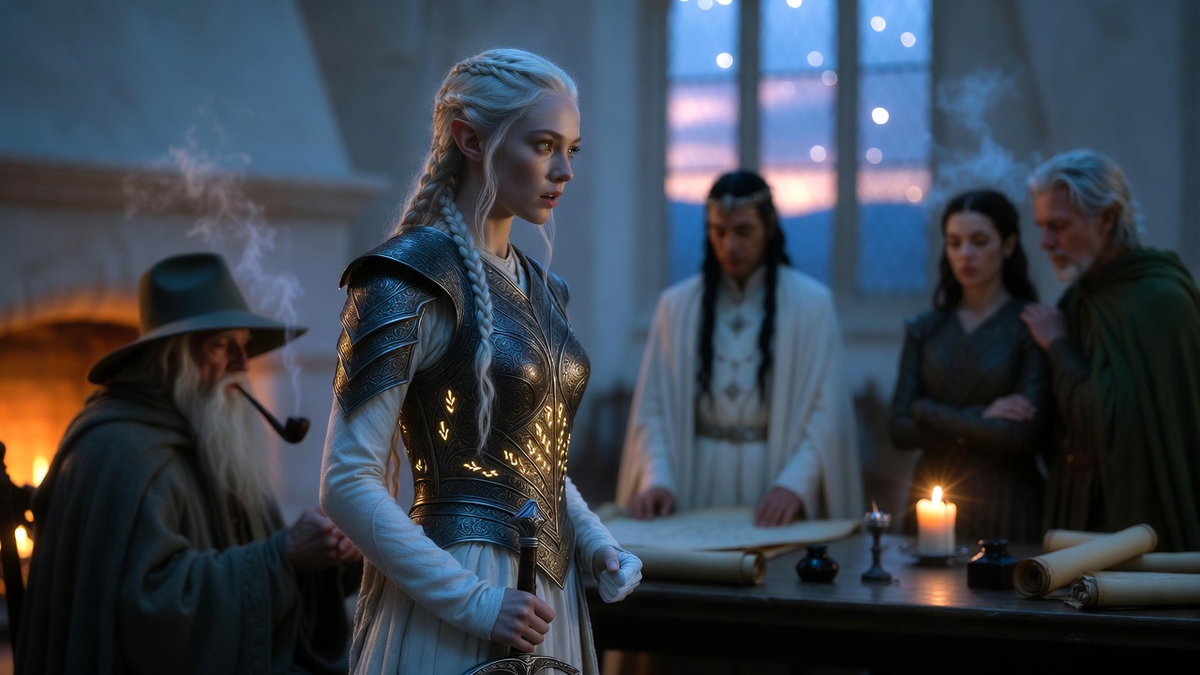 Имладрис встретил их в час, когда солнце уже клонилось к закату, а длинные тени гор ложились на долину, словно плащи древних королей. Река Бруинен пела свою вечную песню, водопады сверкали серебром в последних лучах, а воздух был наполнен ароматом сосен и влажной земли. Город эльфов лежал в кольце высоких скал, где дома, высеченные из белого камня и дерева, казались выросшими из самой природы: арки мостов перекидывались через потоки, террасы садов спускались к воде, а в центре возвышался дворец Элронда — высокий, изящный, с колоннами, увитыми плющом, и окнами, в которых отражались звёзды даже днём. Аэлинэль, Тауриэль и Фаэлон — отец Аэлинэль, присоединившийся к отряду в пути — спешились у главных ворот. Стражи Имладриса, в серебристых плащах, поклонились им с достоинством, узнавая знаки Лотлориэна и Темнолесья. Дорога через ворота вела к главному залу, где ждали Владыка Элронд и Гэндальф. Элронд стоял у высокого окна, глядя на долину. Его волосы цвета воронова крыла были заплетены в к