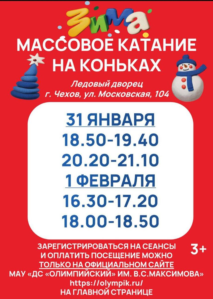 ✨ МАССОВОЕ КАТАНИЕ В ЛЕДОВОМ ДВОРЦЕ 31января и 1 февраля ⛸️31 ЯНВАРЯ Сеансы: 18:50 - 19:40 20:20 - 21:10 ⛸️1 ФЕВРАЛЯ Сеансы: 16:30 - 17:20 18:00 - 18:50 🎵 К вашим услугам качественный лед, хорошая музыка, прокат и заточка коньков. ℹ️ Размеры коньков: с 27 по 46. 💵 Стоимость проката: детские 200 руб., взрослые 300 руб. 🚫 Возраст: 3+ 🏢 Ледовый дворец спорта «Витязь» 📍 г. Чехов, ул. Московская, д.104 🔗 Купить билет: https://clck.ru/3NsBk2 ⭐Поддержать канал голосом ✅ Мероприятия Чехов https://dzen.ru/id/66cc4b48e9ef144699238a51 http://vk.com/chekhov_events http://dzen.ru/chekhov_events