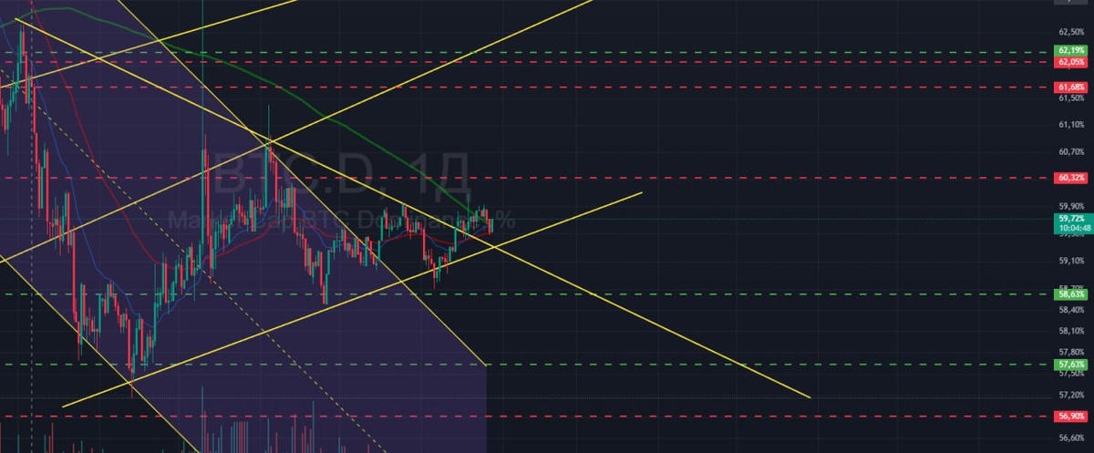 🔽🔼 Доминация BTC стоит спорно, между МА, при этом был ретест треугольника сверху, вопрос выжмут вниз и пойдем на перелой наконец то, или