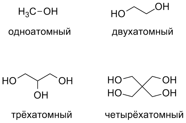 - По числу гидроксильных групп:одноатомные спирты (метанол);