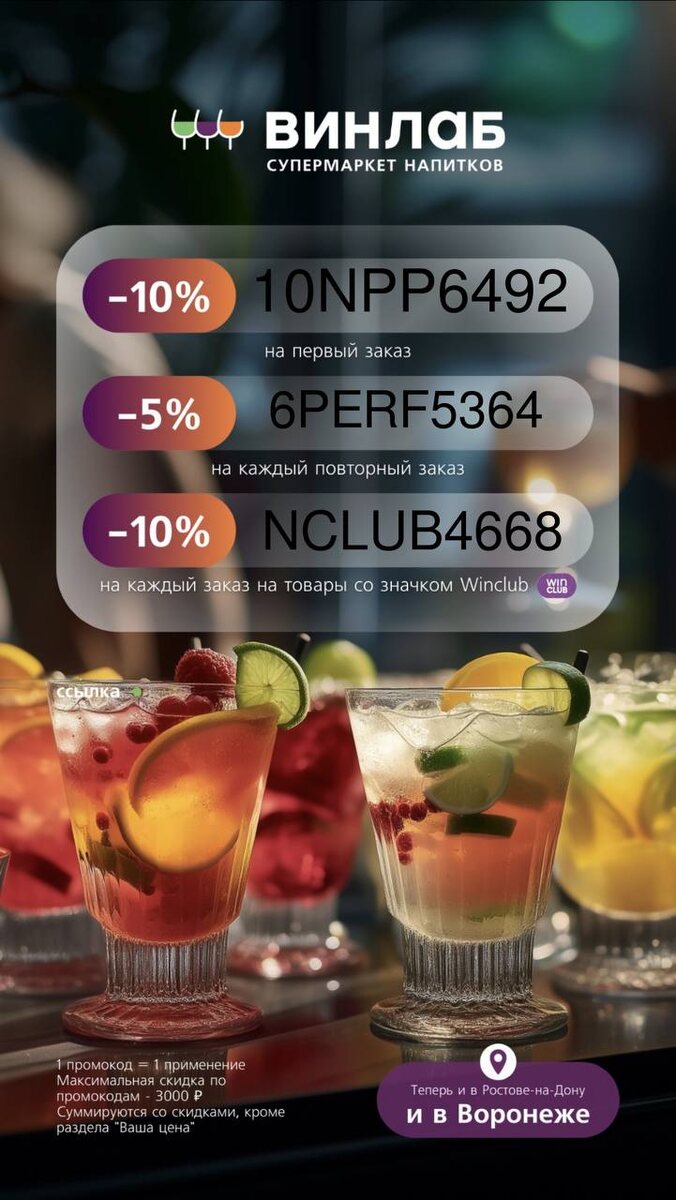 🥂 🍷10NPP6492 - скидка 👍👍🆗 на первый заказ 🍷 6PERF5364 - скидка 👍🆗 на каждый повторный заказ 🍷 NCLUB4668 - дополнительная скидка 👍👍🆗 на каждый заказ товаров со значком WinClub Максимальная скидка по промокодам - 3000 р Суммируются со скидками, кроме раздела "Ваша цена". 1 промокод = 1 применение Ссылка - https://winelab.prfl.me/YulinyZapiski/9ljmu0 🔗 ✅ Канал по скидкам 🔣 Бот с промокодами