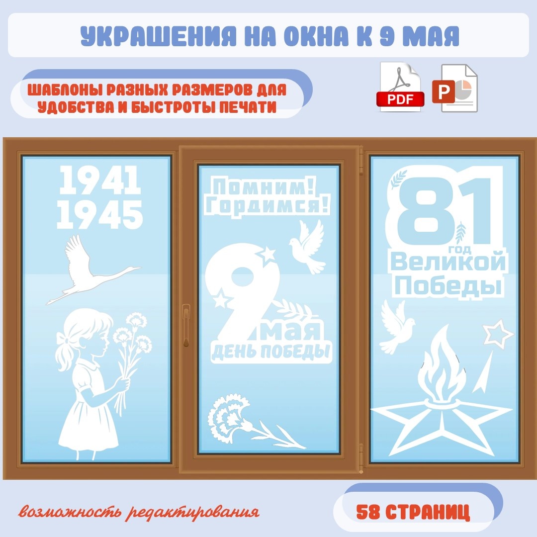 Украшение окон к 9 мая из белой бумаги. Подходит для оформления окон к акции "Окна Победы" в школах, детских садах, квартирах. Шаблоны универсальные. Для примера представлено три варианта украшения окон. Однако вы самостоятельно сможете придумать свою композицию на окне, так как материал содержит достаточное количество различных трафаретов для реализации любых идей. В набор для оформления входят: надписи ("Помним! Гордимся!, "Никто не забыт! Ничто не забыто!", "День Победы", "81 год Победы", "1941-1945", 2026), гвоздика, звезды, голубь, журавль, девочка с гвоздиками, вечный огонь). Шаблоны представлены в формате А4, а также некоторые элементы продублированы в формате А3 для удобства и быстроты печати. Все элементы в формате png, поэтому вы самостоятельно сможете настроить необходимый вариант печати. Материалы ко Дню Победы: