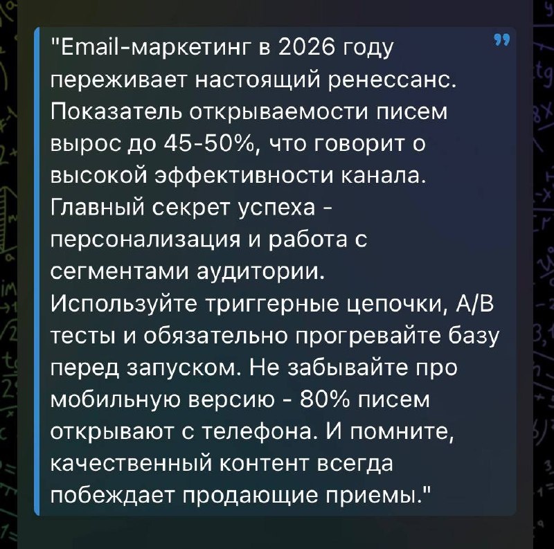 Запускаю новую игру. Показываю текст от нейросети - вы ищете что не так. Тренирует насмотренность, учит видеть где AI врет или выдает шаблон. Вот текст, который ChatGPT написал "эксперту по email-маркетингу" для поста (в картинке)☝️ Выглядит нормально, да? Эксперт вроде как пишет. Но тут есть минимум два, как максимум пять моментов, которые выдают нейросеть с головой. Нашли? Пишите в комментариях что не так. Завтра раскрою и объясню почему это важно замечать. Пишите ошибки в комментарии👇 Подписывайтесь на мой канал в Max